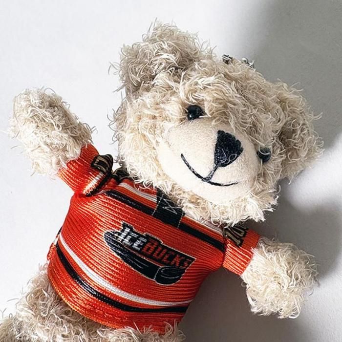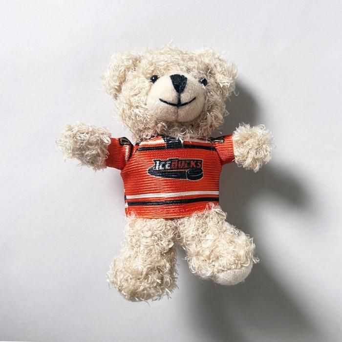 選手が着用しているユニフォームとお揃いのユニフォームをかわいいクマが着ています。